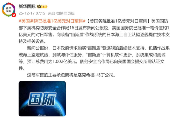 总台记者魏东旭分析表示,日本在冲绳县部署雷达,就是要增加向西南实施窥探的“谍眼”,跟踪监控别国海空力量的正常训练活动。西南诸岛已经被日本打造成一个岛屿基地作战体系,日本突破“专守防卫”原则的军事动作越来越多。 美国务院批准1亿美元对日军售 据新华社消息:美国国防部下属机构防务安全合作局16日发布新闻公报说,美国国务院已批准一笔价值约1亿美元的对日军售,向装备“宙斯盾”作战系统的日本海上自卫队驱逐舰提供技术支持及相关设备。